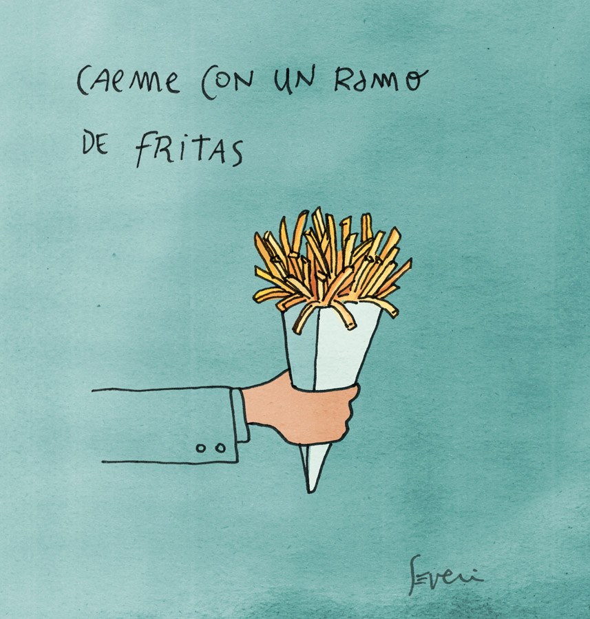 Ayer, después de ver la caricatura de Marcos Severi del ramo de papas fritas, me puse a pensar en lo genial que sería unir a la gente con el fin de crear una campaña que le diera la vuelta a los clichés amorosos. Originalidad ante todo, sería el lema de la misma, y una de sus consignas sería: Las rosas huelen muy bien… pero las papas saben mejor. Por supuesto, contrataría un director de publicidad para esas cosas (en la línea anterior me di cuenta que no sirvo como jefa de marketing) y a alguien que se encargara de darle publicidad a los ideales de regalos nuevos.