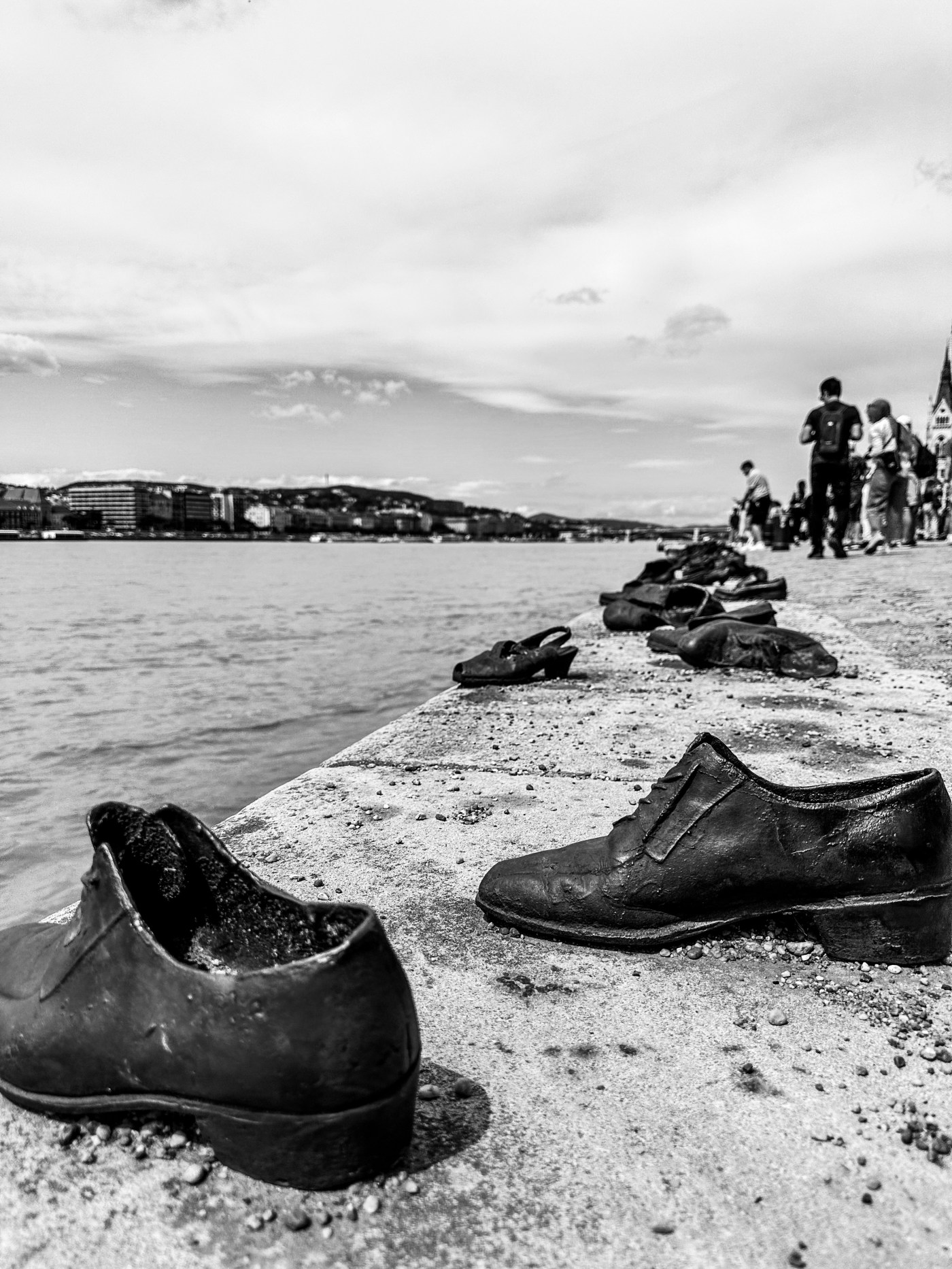 La hilera de zapatos, justo a una de las orillas del Danubio, pretende recordar a las víctimas. Aquí no hay flores, pequeñas piedrecitas llenan los zapatos.